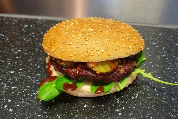Lekker met sla, augurk, gedroogde uitjes en saus!